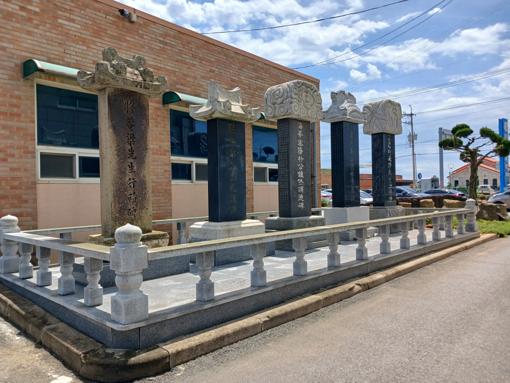 이 중에서 ‘국사박채진선생공적비’는 서인섭주사공덕비 낙성식을 반대한 마을청년회의 한 명인 박채진(1903~1952)의 공적비로 비문은 청화스님이 지었다. 원래는 팔학마을 면 소재지 입구에 있었다. ‘행만호강공량수경모비’의 강양수는 다경진(多慶津: 운남면에 있던 수군진지)의 만호를 지낸 인물이며, ‘해봉밀양박공종휴송덕비’는 망운면의 제13대 면장인 박종휴의 송덕비이다. ‘묵헌정선생기적비’는 운남초둥학교 설립의 공이 있는 정문명을 기린 비이며,‘수암양선생행적비’는 학포 양팽손의 후손인 수암 선생의 행적비로 기광연(寄光衍)의 찬과 김영배(金英培)의 서체로 씌었다. 비석군 옆으로는 지석묘로 보이는 거석 1기와 그 거석을 돌아가며 돌절구들이 놓여 있다.
