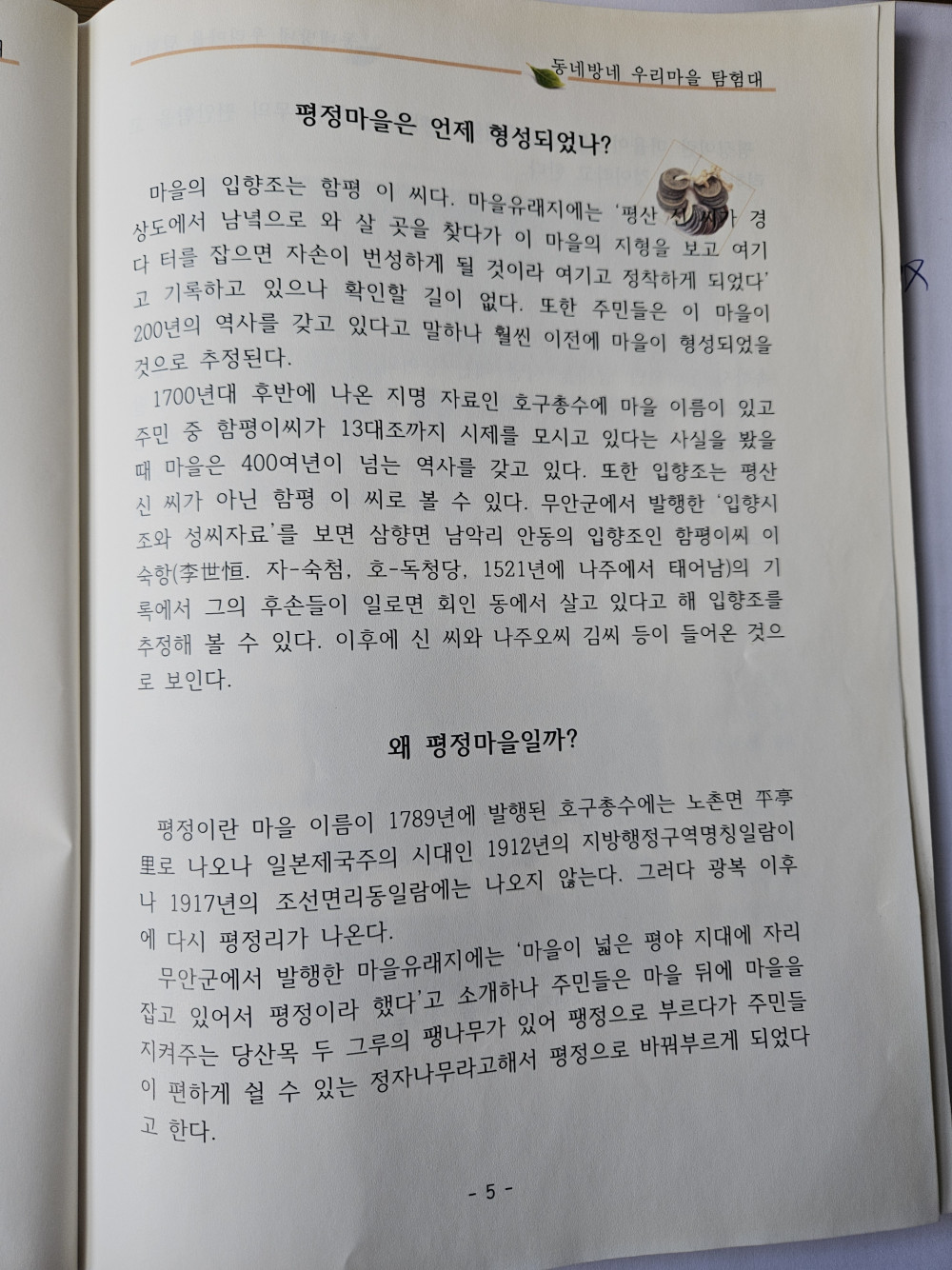 무안군에서 발행한 마을유래지에는 ‘마을이 넓은 평야 지대에 자리 잡고 있어서평정이라 했다’고 하나 주민들은 더 자세하게 설명한다. 마을 뒤에 두 그루의 팽나무가 있는데 팽나무는 마을을 지켜주는 당산목이라 부르기도 하지만 주민들이 편하게 쉴 수 있는 정자나무라 하기도 한다. 해서 처음엔 팽정으로 부르다가 평정으로바뀌어진 것이다. 즉 평정이란 마을이름은 평야지대의 위치성과 정자나무의 편안함을 고려하여 지은 것이라고 한다.