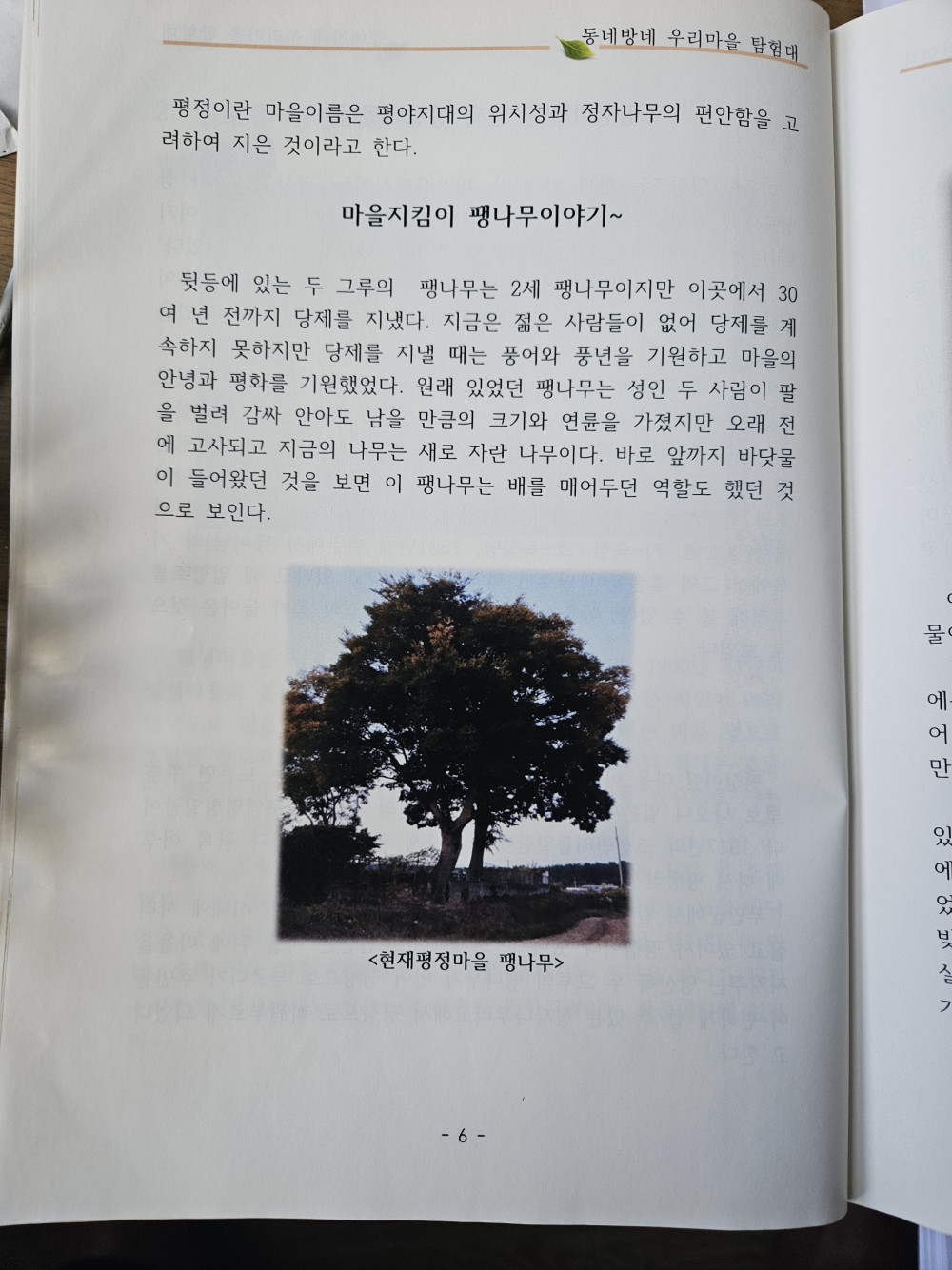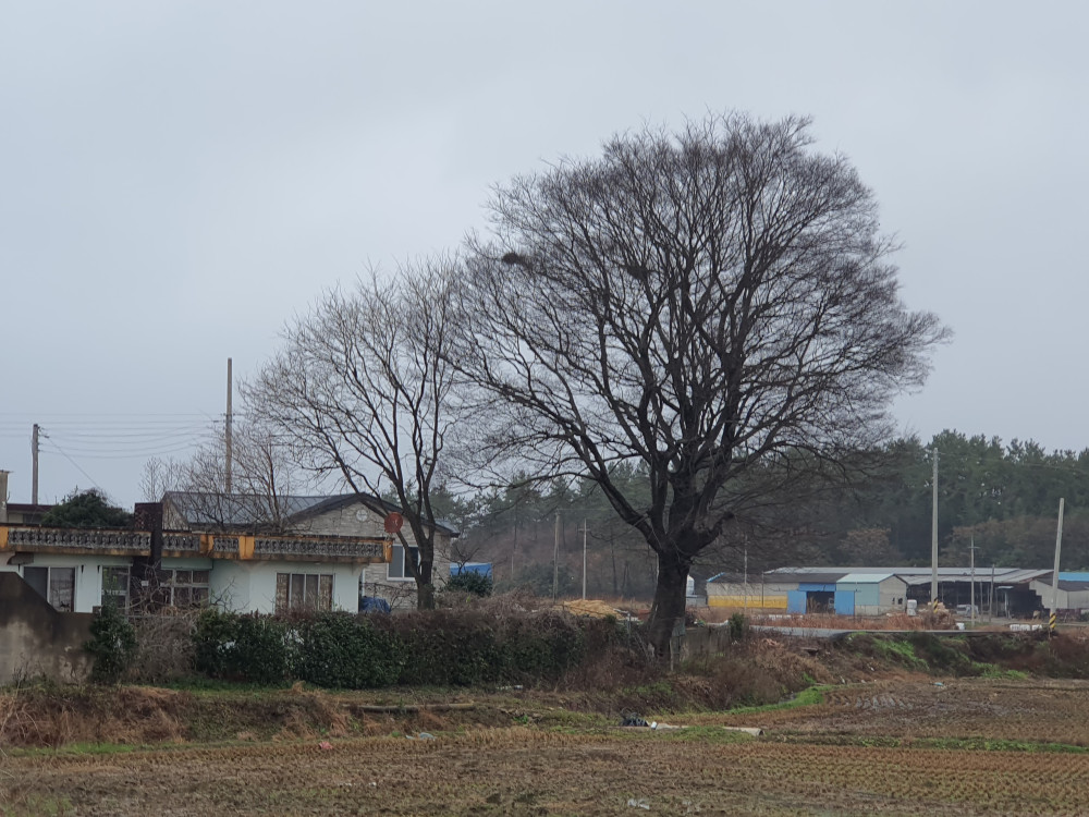 마을 뒤에 두 그루의 팽나무가 있는데 팽나무는 마을을 지켜주는 당산목이라 부르기도 하지만 주민들이 편하게 쉴 수 있는 정자나무라 하기도 한다.