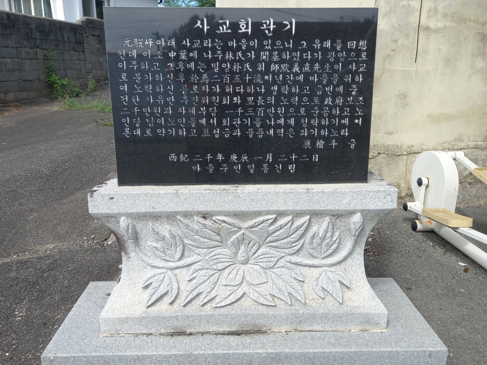 마을 앞 들의 지형이 소쿠리 형이다. 해서 비가 오면 들 주변에 있는 광암리 상신기리 산정리의 물이 마을 앞으로 모이게 된다. 이때 함께 몰려온 모래들이 쌓이고 쌓여 모래둑을 쌓았는데 이 모래둑을 이용해 건너 마을 학두리를 다니면서 사교라 하지 않았는가 하는 생각이 든다. 마을유래지에도 ‘마을이 형성될 당시 마을 어귀에 냇가가 있었는데 이곳에 많은 모래가 쌓여 다리처럼 생겼다 하여 마을 이름을沙橋라 하였다’고 기록하고 있다
