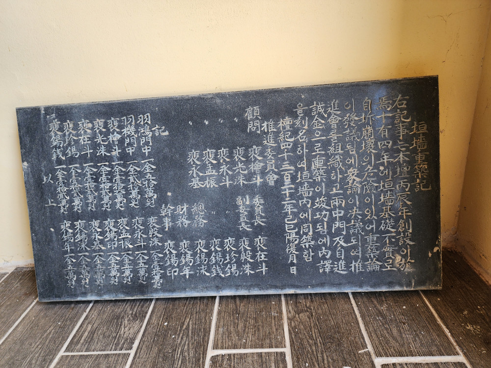 산 자락에 효부각과 양호단 그리고 원모재가 있다. 1989년에 세워진 효부각은 면와 배회두 선생의 부인인 전주 최씨의효행을 그리는 비각이다. 羊湖壇은 현재의 마을에서 보면 맞은편 두남산 중턱에 자리하고 있으며 1975년11월 15일에 후손들이 기금을 모아 세운 달성 배씨의 문중단이다. 이 단에는 배운용(달성군, 달성배씨의 수관조)과 배윤우(입향조, 권수암 선생의 문인)를 모시고 있다. 두 분의 충의, 문장, 덕행을 추모하기 위하여 세운 단이며 매년 3월 5일에 제사를 지낸다. 양호단 안에는 1987년에 세운 ‘동몽교관만헌배공사적비’가 있다. 또한 원모재는 4칸 팔작지붕으로 1957년에 세웠으며 1986년에 중수했다. 재각 안에는 15개의 현판이 걸려 있으며 몸채를 빙 둘러서 마루를 깔았다. 재각 바로 아래에는 납따바위가 있다. 원모재는 대삽속에 있고 삼월 삼짓날 시제를 지내며 25명에서 30명이 제를 지낸다. 납따바위는 배를 세우는 장소였다. 마을 앞에 1988년에 세운 달성배씨만헌공파세거비와1989년에 세운 면와거사배회두공적비가 있다