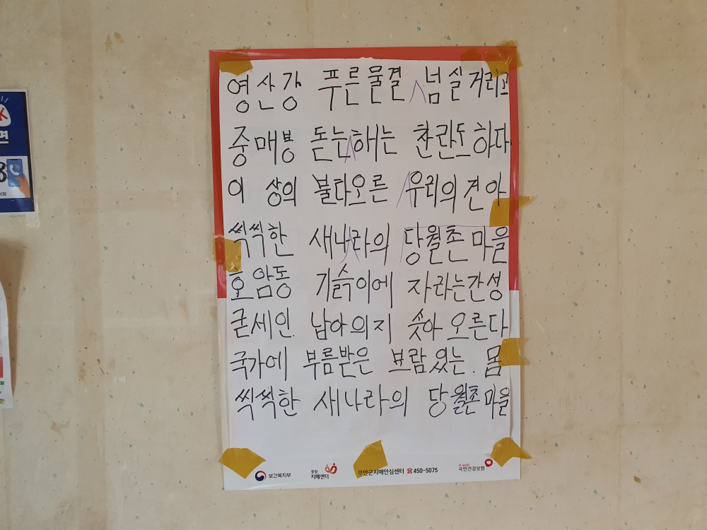 마을 노래가 있다. 마을찬가 인데 마을이 만들어진 이야기 이고 어르신들이 모여서 마을 노래를 불러주셔서 녹음하여 자료로 보관할 수 있었다.