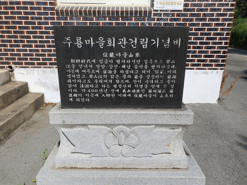 문헌에도 1789년에 조선왕조에서 펴낸 호구총수에는 노촌면 용호리로 나온다. 1912년 지방행정구역명칭일람에는 일로면 龍湖洞, 1917년에 조선면리동일람에는 일로면 청호리 注龍洞으로 나오다 이후에는 청호리住龍이라 나온다. 실지로 무안지망집과 입향시조 그리고 성씨자료에도 注龍이라 나오지만 마을 탐방시 확인했던 소포공의 묘비에서는 住龍이라 나온다. 또한 대동여지도에 망모산을 住龍山으로 표기하기도 했다.