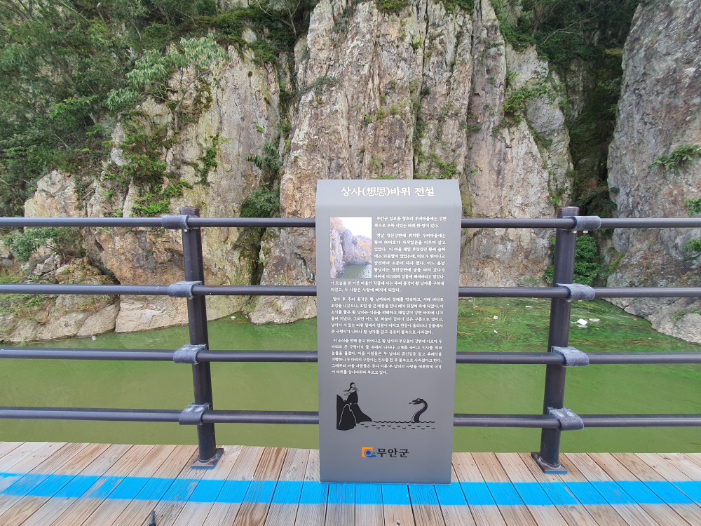 게 되었고 두 사람은 사랑에 빠지게되었다. 얼마후 추씨총각은 황낭자에게 장례를 약속하고 서해바다로 조업을 나갔으나 큰태풍에 배가 뒤집혀 죽게되었다. 이 소식을 들은 낭자는 식음을 전폐하고 매일같이 강변바위에 나가 울며 지냈다. 그러던 어느날 하늘이 갑자기 검은 구름으로 덮이고 낭자가 서있는 바위밑에서 섬광이 비치고 천둥이 울리더니 강물에서 큰구렁이가 나타나 황남자를 감고 유유히 물속으로 사라졌다. 이 소식을 들은 황낭자의 부모님이 강변에 이르자 두 마리의 큰구렁이가 물속에서 나타나 연신 고개를 숙이고 인사를 하며 눈물을 흘렸다. 사람들은 두남녀의 혼신임을 알고 혼레식을 거행하니 두 마리의 구렁이는 인사를 한 후 물 속으로 사라졌다고 한다. 그때부터 마을 사람들은 못다 이룬 두 남녀의 사랑을 애틋하게 여겨 이 바위를 상사바위라 부르고 있다.