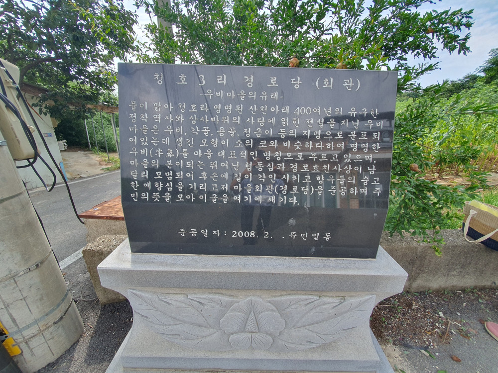 우비는 용골, 각골, 생기미, 우비, 대밭골을 포함하는 마을로 청호3리에 해당하며 ‘소코 마을’로 불리기도 한다. 용골은 회관이 있는 마을이고, 각골은 소뿔을 의미하고 갑등이라고도 한다. 생기미는 생금밭으로 돈이 생기는 (生金). 우비는 소의 코에 해당하는 부위이고 대밭골은 못난이 미술관 자리이다.