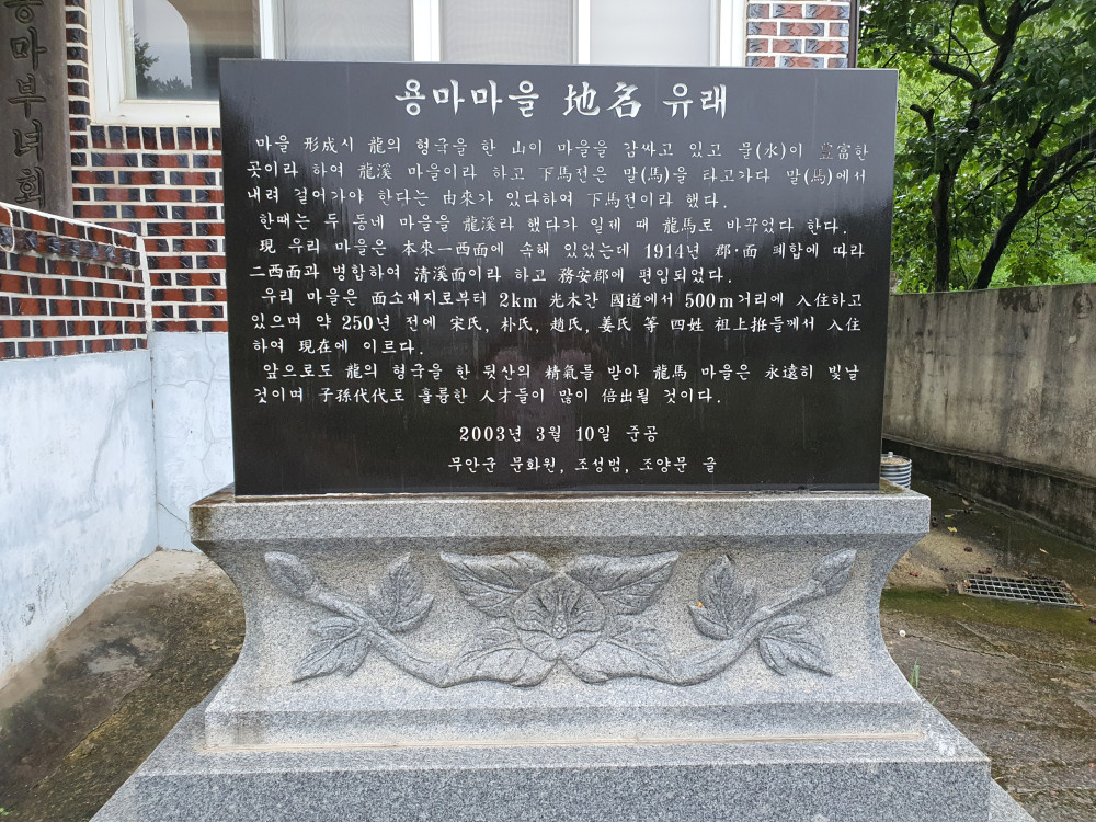무안군에서 발행한 《마을유래지》에는 ‘마을 형성 시 용(龍)의 형국을 한 산이 마을을 감싸고 있고 물이 풍부한 곳이라 하여 하마전, 두동리 마을과 함께 ‘용계(龍溪)’라 했다‘고 하니, 뻗어 내린 산의 형세가 용처럼 마을을 감싸고 있으며 물이 좋은 곳이었음을 알 수 있다. 이를 주민들은 ‘소쿠리형’이라는 풍수로 알고 있으며, 이는 마을의 산세가 외풍을 막아주고 낙엽 등이 모여서 잘 산다는 의미를 지닌 '소쿠리형' 또는 ‘삼태기형’의 명형국지(名形局地)의 한가운데 있는 마을이라는 뜻이다.