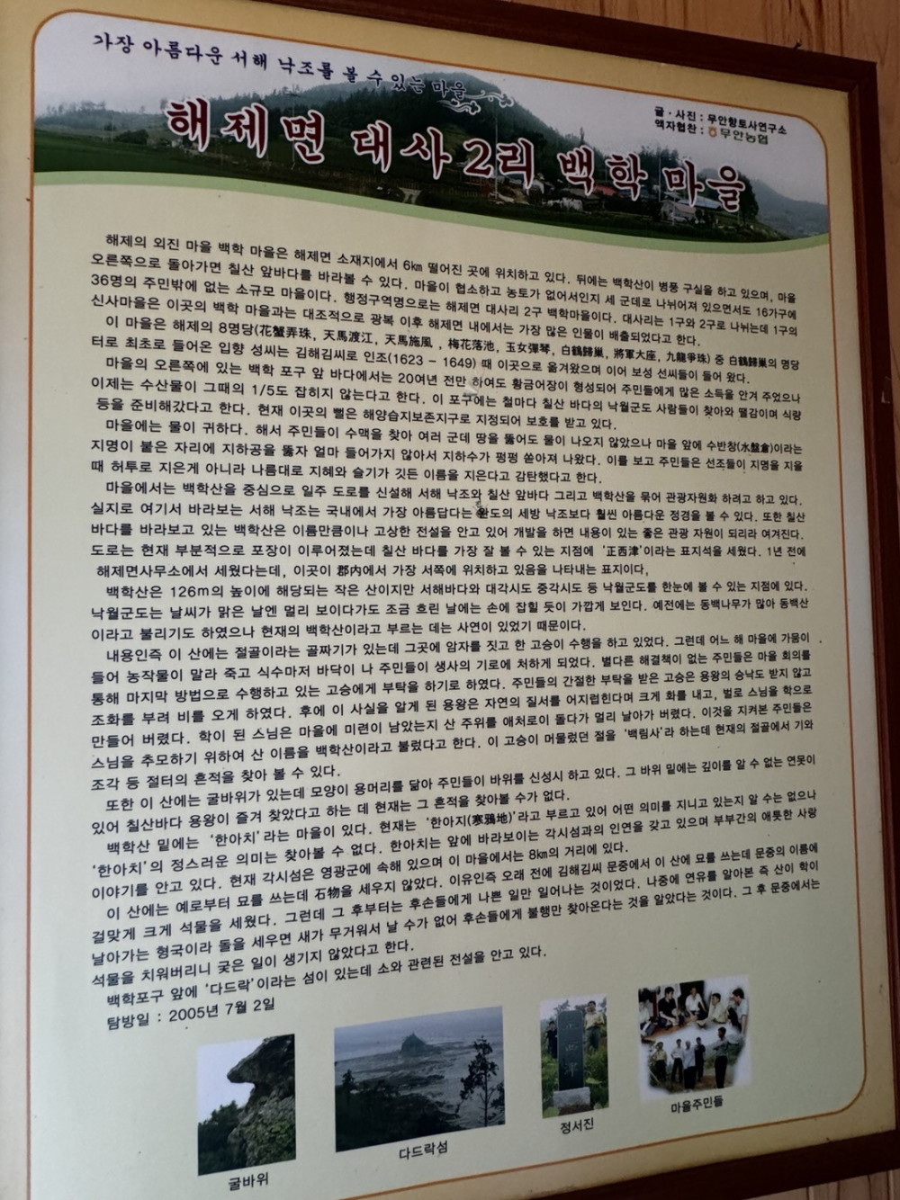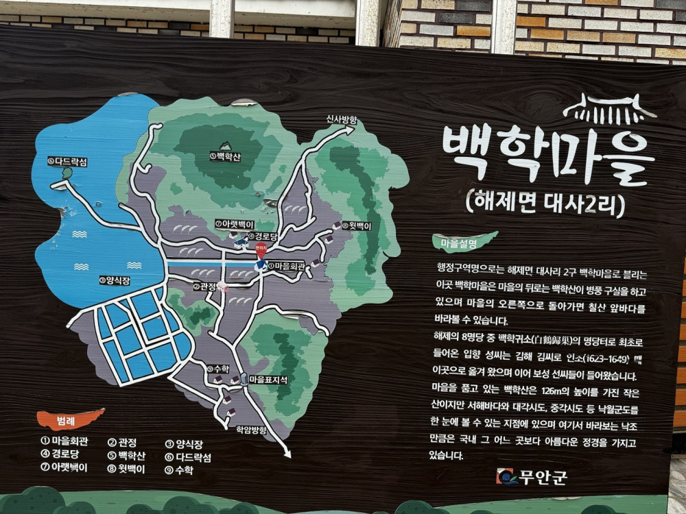 전남 무안군 대사리 백학마을은 해양습지보존지구로 지정되어 보호받고 있는 지역이다. 이곳은 칠산 앞바다와 연결된 갯벌을 포함하고 있으며, 생태적으로 중요한 역할을 하는 습지이다. 해양습지보존지구로 지정된 이유는 이 지역이 다양한 해양 생물의 서식지로서 생물 다양성을 유지하고, 환경 보존에 기여하기 때문이다. 백학마을의 갯벌은 과거에는 황금어장으로 알려져 주민들에게 많은 소득을 제공했지만, 현재는 수산물 생산량이 감소하여 보호가 더욱 중요해졌다. 이 지역은 관광자원화 계획도 진행 중이며, 백학산과 서해 낙조를 포함한 자연경관을 활용하여 관광 명소로 개발하려는 노력이 이루어지고 있다.