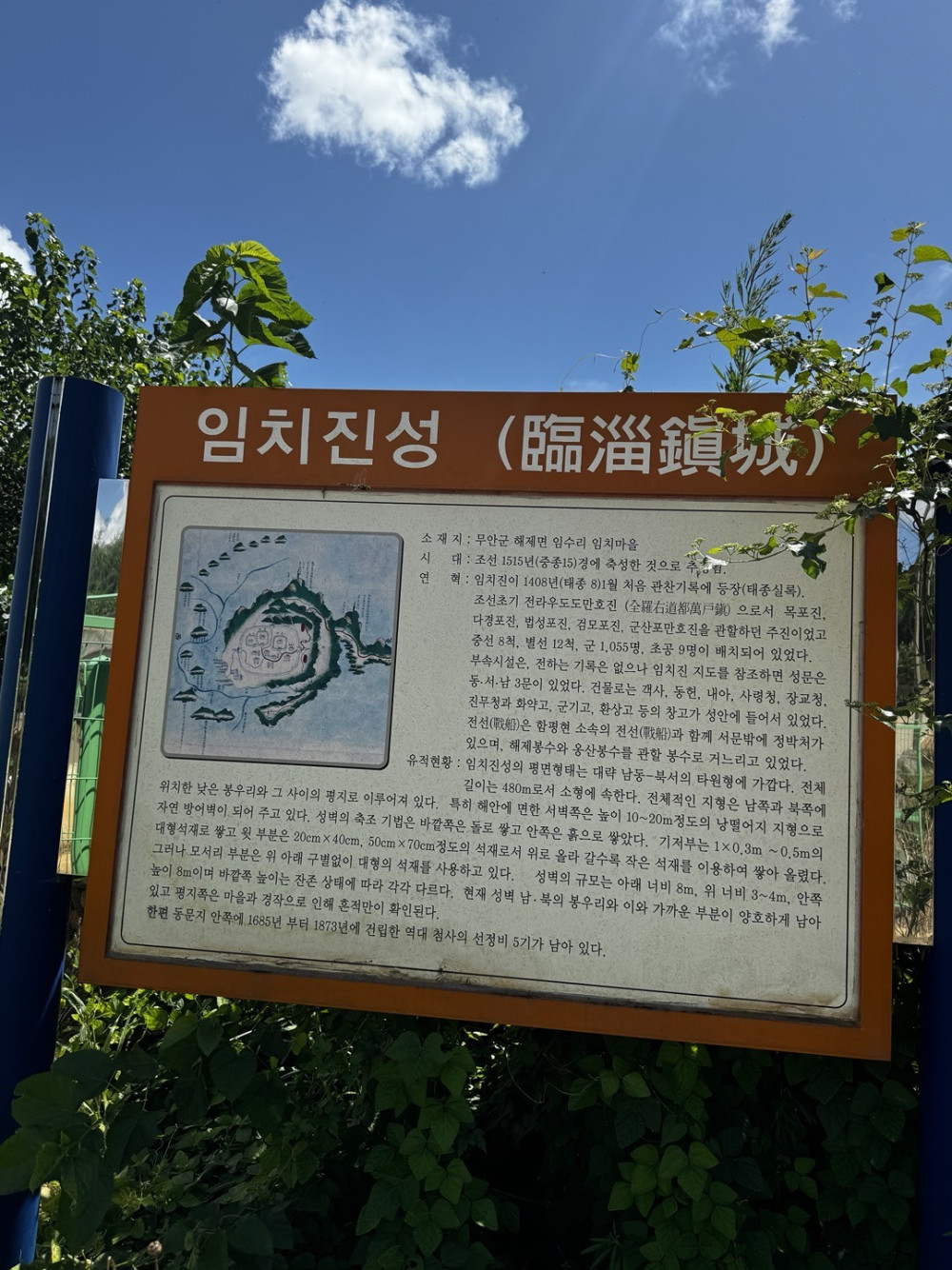 - 이 마을에 있었던 임치진성(臨淄鎭城)은 사실 시작을 알 수 없을 정도로 오래된 역사에서 기원한다. 문헌에 나오는 임치진은 지도(智島)를 마주보는 해안(對岸)에 위치한 수군진이었다. 임치진성의 흔적은 훼손되어 있긴 하지만 지금도 일부가 남아있다. 임치마을 앞의 서해바다는 중국으로 향하는 항로(航路)일 뿐만 아니라, 한양 등으로 가는 조세운반의 해양 길목에 해당되어 군사적으로나 경제적으로 대단히 중요한 지역이었다. 삼국시대 이전부터 이곳에는 군대가 주둔하는 진지가 있었던 것으로 추정되고 있다. 고려시대 이전까지는 임치진성에 대한 기록이 보이지 않으며, 조선시대에 이르러 자세한 기록이 남아있다. 세종실록지리지(1454년)와 동국여지승람(1481년) 등에는 전라우도수군첨절제사가 있었던 임치진과 임치진성이 지녔던 규모와 내용 등이 상세히 기록되어서 전한다. 이외에 기록된 ‘임치진 지도’ 등을 살펴보면, 성문(城門)은 동·서·북문 등 세 개가 있었고, 관아 건물로는 객사를 비롯하여 동헌, 내아, 사령청, 장교청, 진무청과 화약고, 군기고, 환상고 등의 창고가 성안에 있었다. 현재 문지(門址)나 성내의 건물지 등은 확인하기 어려우나 성축의 범위는 파악되었다. 자료를 보면 진성의 평면 형태는 대략 남동-북서의 타원형에 가깝다. 전체 길이는 480m로써 소형이며, 전체적인 지형은 남쪽과 북쪽의 낮은 봉우리와 그 사이의 평지로 이루어져 있다. 임치진성은 입지상 우리나라 읍성에서 일반적으로 볼 수 있는 평산성(平山城) 형태를 취하고 있다. 성벽의 축조기법을 살펴보면, 바깥쪽은 돌로 쌓고 안쪽은 흙으로 채운 내탁법을 이용했다. 북쪽 해안은 천연 낭떠러지를 이용하여 상부만 축성하고 그 밖에는 70×60㎝의 방형 석재를 이용해 쌓았으며, 동쪽에 길이 100m, 높이 350㎝, 폭 2m의 성축이 잘 보존되어 있다.