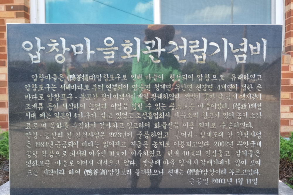 목동2리에 속한 「압창」마을은 마을은 근대에 들어서 형성된 마을이다. 조선시대에 발간된 《호구총수》에도 나오지 않고 1914년 일본인에 의해서 실시된 전국적인 행정구역 개편 때에도 나오지 않았던 지명이다. 하지만 예전의 마을 이름인 「압창(鴨唱)」을 통하여 갈매기 떼가 모여드는 연안의 해변지역이었으며, 이후 바뀐 「압창(押倉)」이라는 지명을 통해 곡물창고가 생기면서 마을이 성해졌음을 알 수 있다. 현재는 근처에 형성된 무안국제공항으로 해서 광주-무안 고속도로는 물론 호남고속철도 등이 건설되어 교통의 요지가 되고 있다.