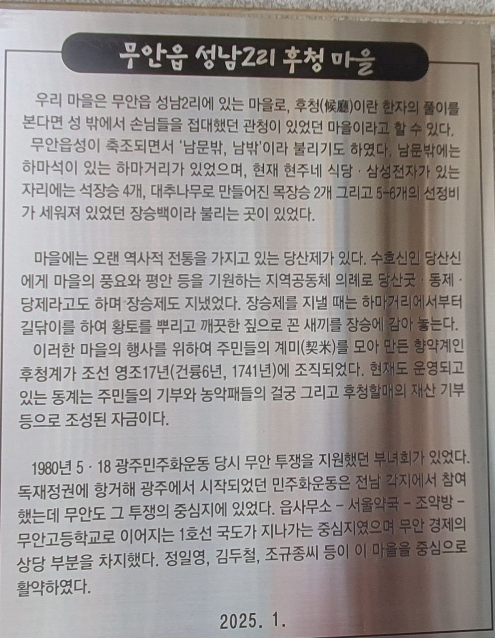 조선 초 축조된 「무안읍성」의 남쪽에 자리한 마을로 성남리라 하며 1988년 성남리 「후청」마을에서 성남1리 「일신동」과 성남2리 「후청」마을로 분리되었다. 「후청」마을은 성남2길을 따라 형성된 마을로 무안읍 중심지와 가까우면서도 조용하고 정갈한 주거환경을 갖춘 마을이다.