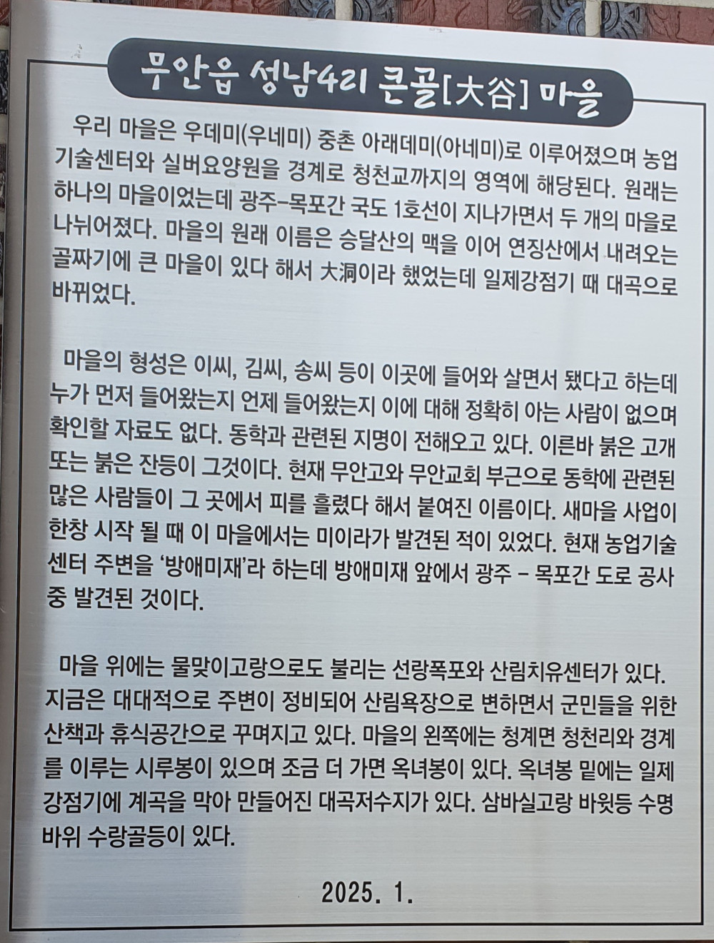 문헌으로 지명의 변화를 보면 1789년의 자료인 《호구총수》에는 마을 이름이 나오지 않지만, 1912년의 자료에서 외읍면 「대동내리(大洞內里)」가 나오고 1917년의 자료에도 외읍면 「대동내리」로 나온다. 이후 1987년의 자료에서 지금과 같이 무안읍 성남리 「대곡」으로 나온다.